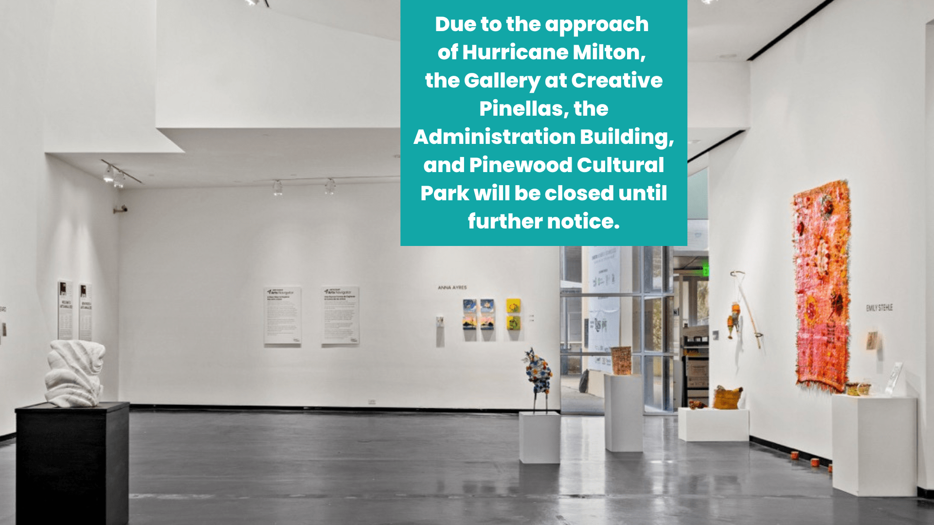 Due to the approach of Hurricane Milton, the Gallery at Creative Pinellas, the Administration Building, and Pinewood Cultural Park will be closed until further notice to ensure the safety of our visitors, staff, and the incredible works of art in our care. We will continue to monitor hurricane updates throughout the week and will announce