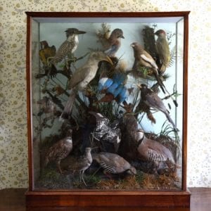 Down the block from my elementary school was the town library. The bottom floor held the children’s section. Immediately to one’s right after entering was a glass vitrine containing a staged woodland scene populated by taxidermied birds (similar to the one pictured above).