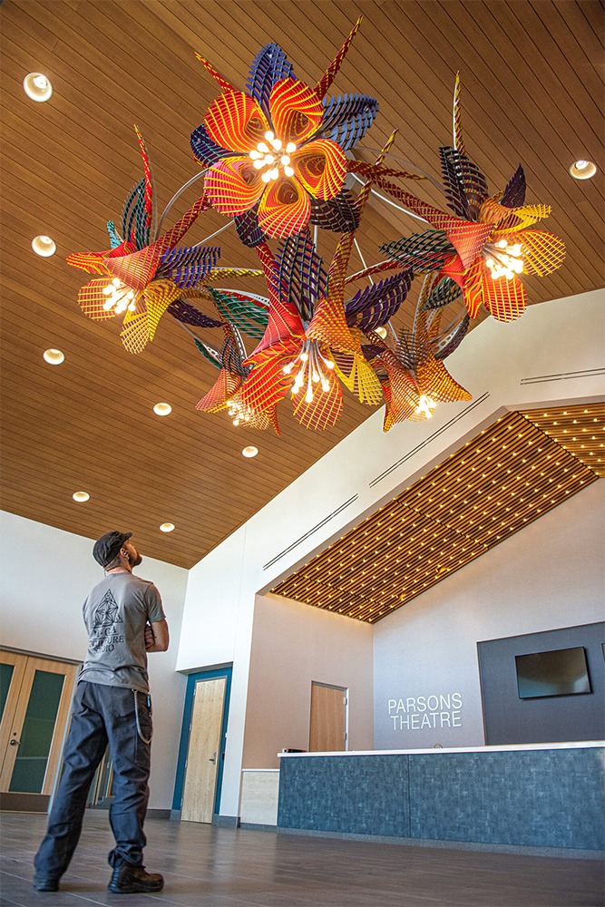 MGA‘s Illumination is a 15′ diameter acrylic chandelier located in Northglenn, Colorado. Based on the state flower of Colorado, the columbine, this sculpture greets you as you enter the Parsons Theater at Northglenn’s newest community center. Installed in September 2021, this is one of MGAs most ambitious projects, consisting of over 4,000 pieces.