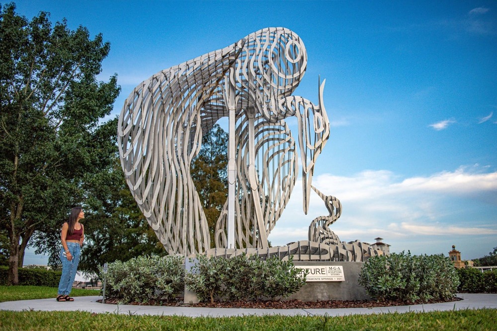 Nurture is MGA‘s 20’ tall crane sculpture located in Altamonte Springs, Florida. Installed at the popular Cranes Roost Park in May 2021, the sculpture depicts intimate scene of a mother crane and her baby colt.