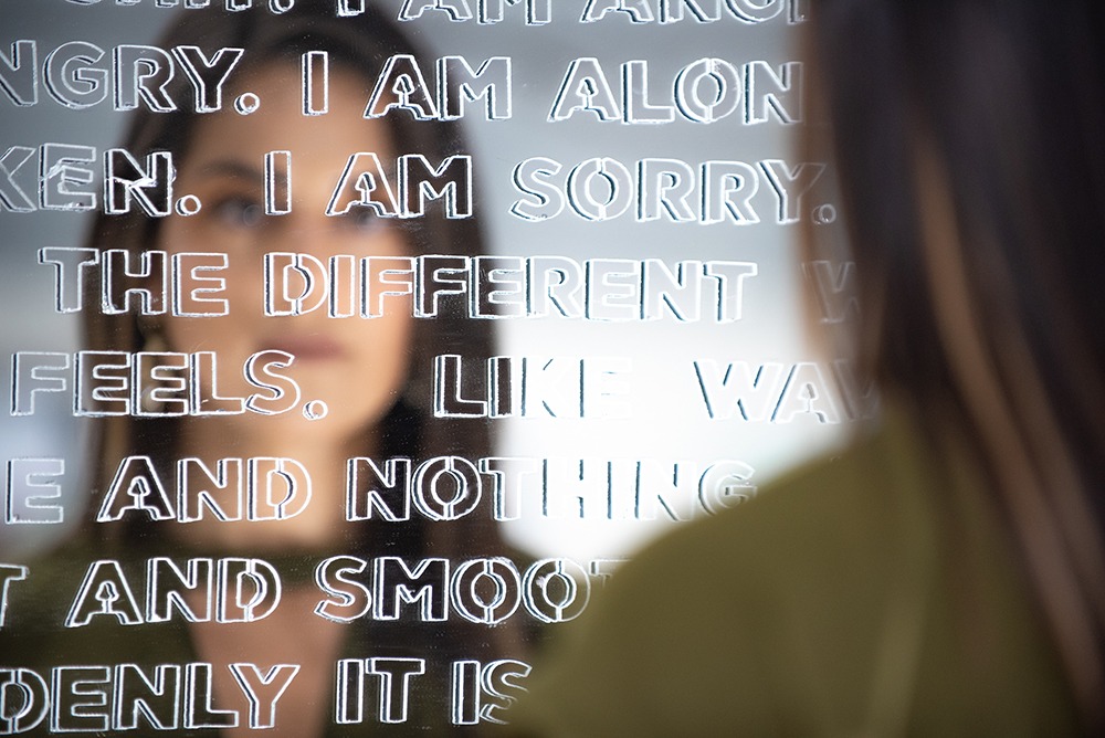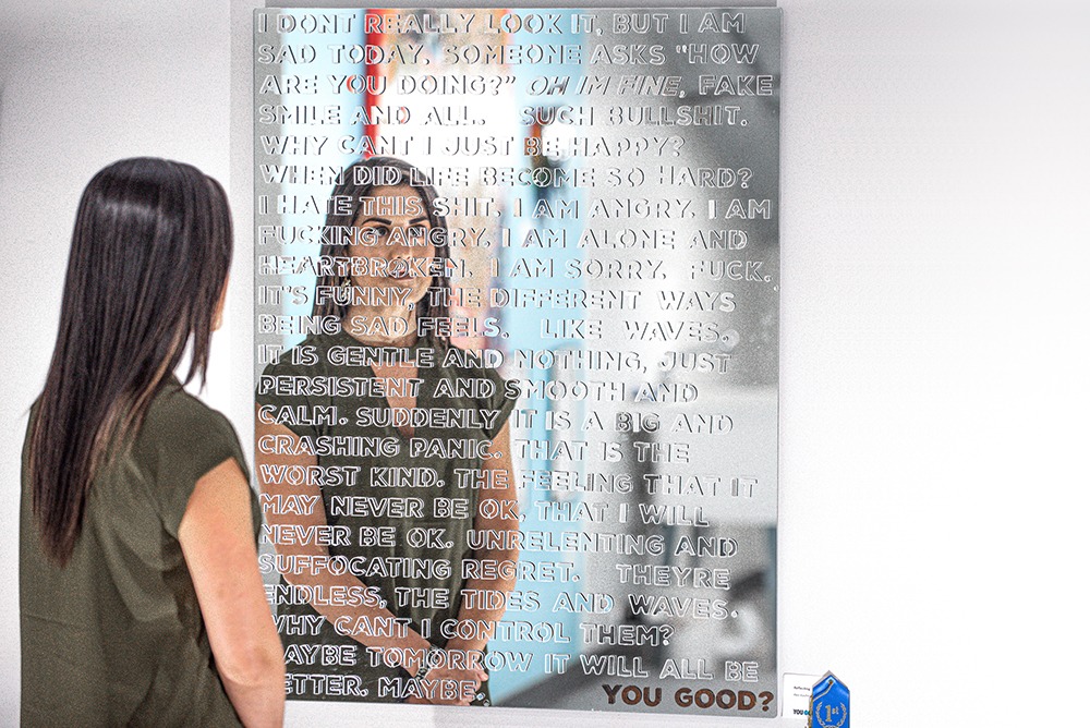 Reflecting was a piece made for the ArtsXchange show You Good?, an exhibit amount mental health in January 2021. 15 artists were awarded a $1,000 commission each to create their work. My piece was a 30″ x 40″ mirror sculpture with waterjet cut mirror letters. It won the Grand Prize of $2,500.
