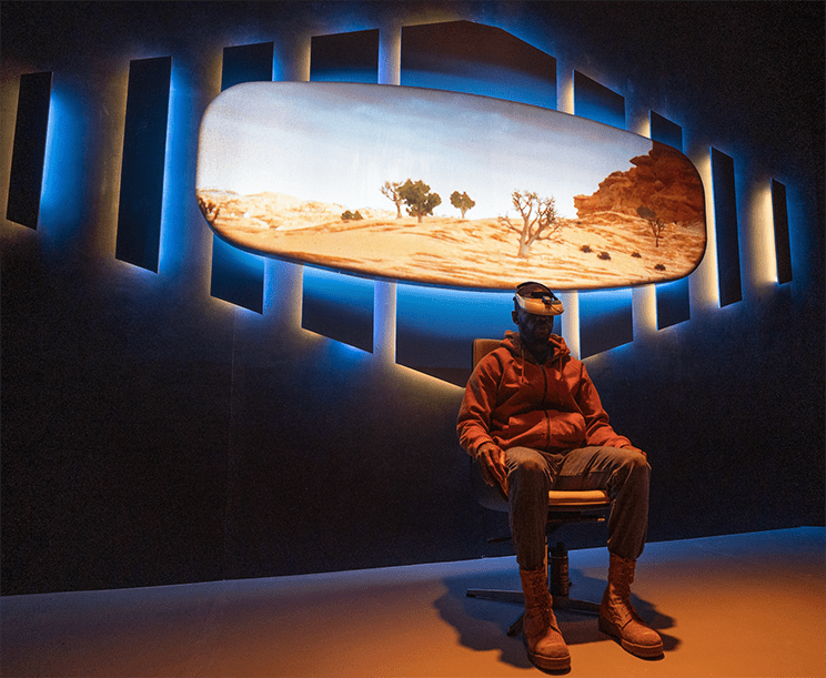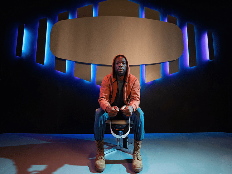 In Goldfinger’s Backwards Forwards Back that intimacy was crucial. Actor L. James plays a soldier returning from war. Seated in an armchair with a Virtual Reality headset, he talks to us about the VR therapy he is undergoing to rid him of his PTSD nightmares. A screen behind him projects the scenes he is seeing during his therapy – a desert, a burning building.