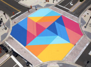 As soon as we were back home, we got to work on our next move which became the first painted intersection in downtown Clearwater. The design had to capture the beauty and vibrancy of our Gulf Coast in an abstract yet dynamic and colorful way. So I came up with a geometric design that activates the intersection while providing a welcoming focal point for downtown Clearwater.