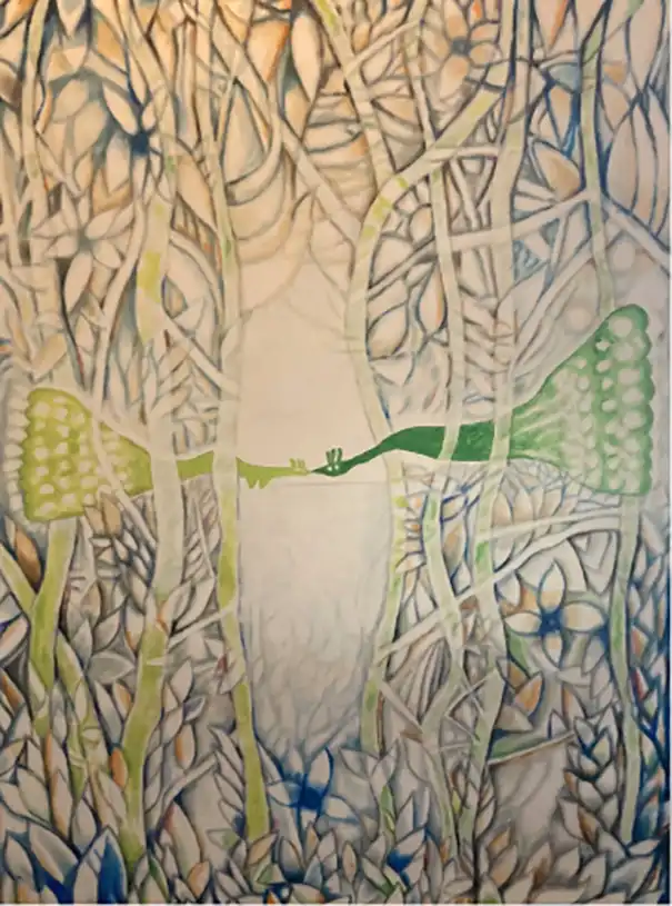 Jardines Invisibles 1 also showcases Froilán’s unique approach to color in which he sets intricate and sinuous forms within a grayscale, then subtly introduces a wide range of colors to accentuate them.