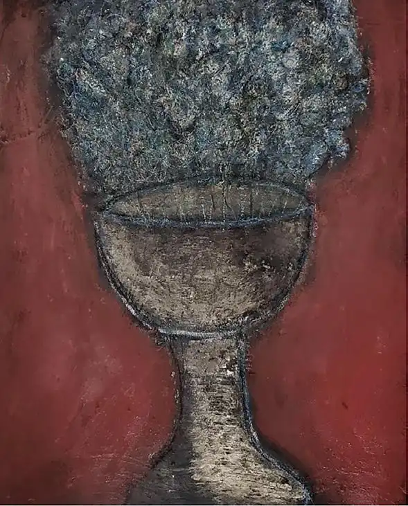 One of the best is Jarrón, showing a vase resembling a mystical chalice from which a hazy mist of flowers springs forth against an oblique smoky red background, combining hope and foreboding within a seemingly simple still life.