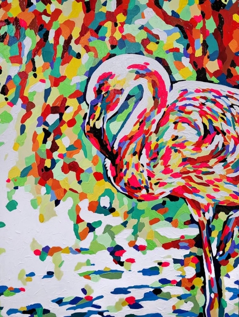 Dans’ standout works in the exhibition include Flamingo I and Tenderness I (showing a family of giraffes), both from his Color is Life series. These works include Impressionist elements, such as Pointillism, to convey movement and energy within a framework of Pop Art that brings additional universality to his work while maintaining their intimacy.