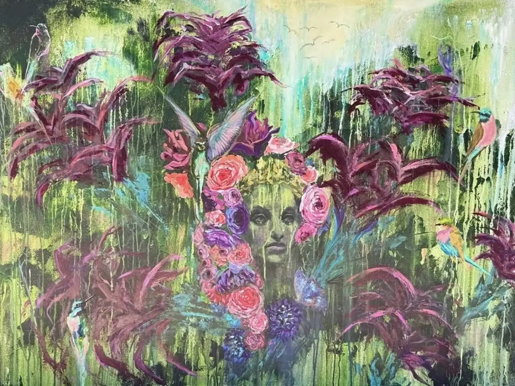 With opaque dark green backgrounds, they reach into the primordial and palpably embody the exhibition’s environmental theme by making nature feel truly alive, as though you are witnessing Mother Nature herself emerging from each canvas, inviting you to experience her firsthand.