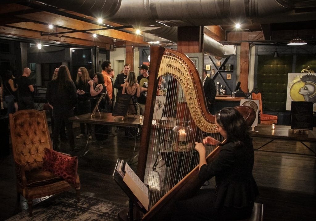 Harpist Rebecca Cosas performs at “Black-White-Gold,” last week’s art show at The Station House. Photo by Daniel Veintimilla
