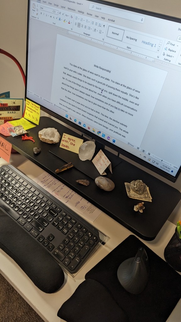 “It’s been over a year since you’ve had a drink. This time, the elective sobriety centered on two back-to-back breast surgeries that scared and scarred you. The whole time you thought it was cancer.
