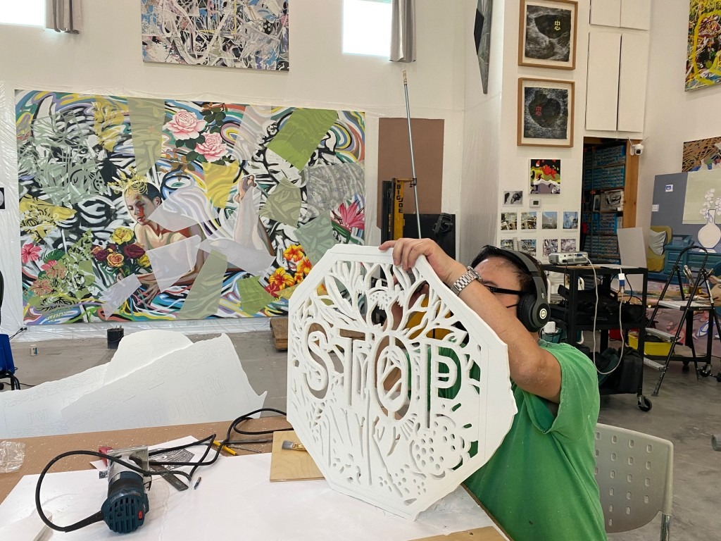Visitors can walk through the gazebo enjoying a 360° view of carved panels depicting young GimGong tending the gardens and citrus trees. The gazebo is created in the same style as the street sign, but painted in pink symbolizing GimGong’s personal lifestyle. There is a light inside the gazebo projecting patterned shadows on the gallery floor.
