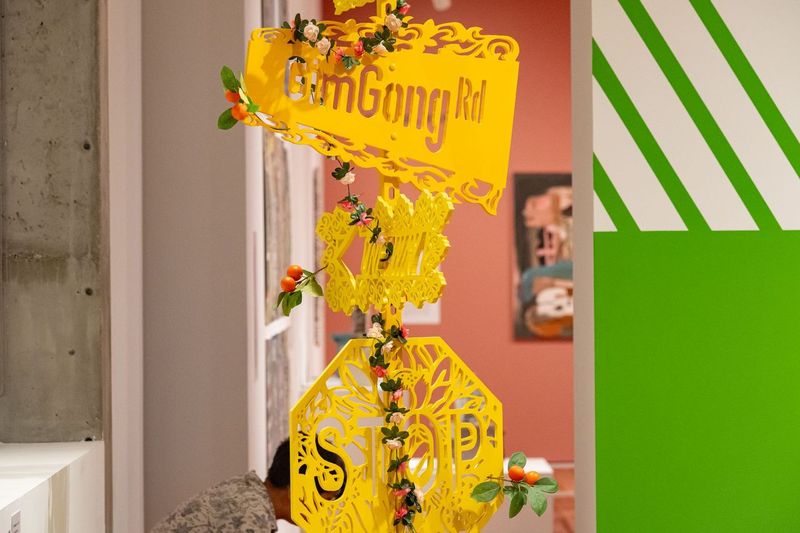 I adopted the Asian aesthetics of papercuts for the sculpture. I painted the street sign in shades of yellows to represent the Asian identity in a western context. There is a patch of green grass at the bottom of the sculpture and flowers growing upwards along the pole.