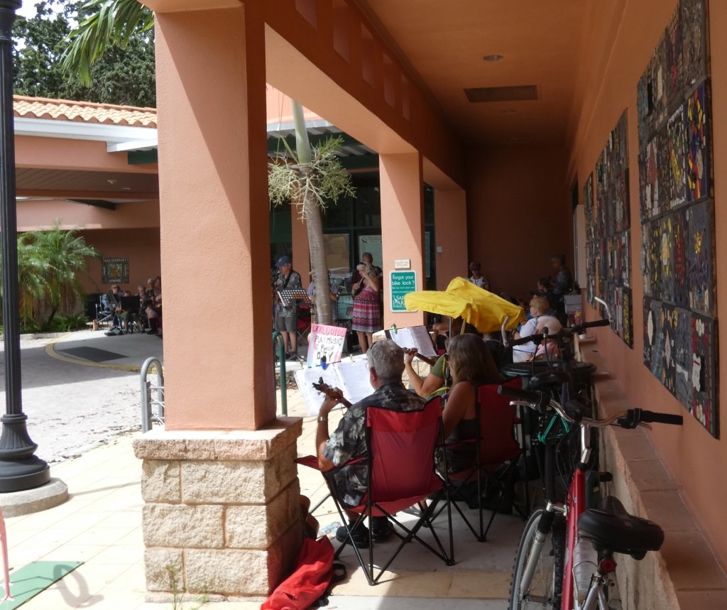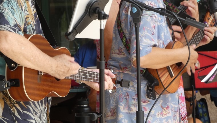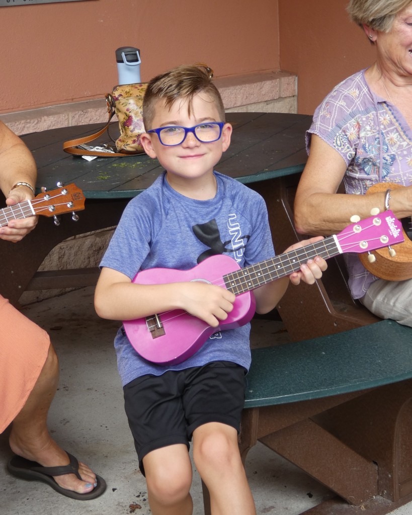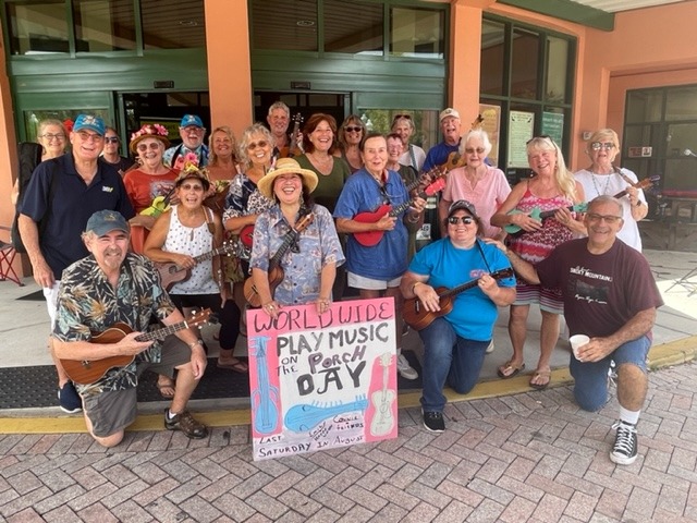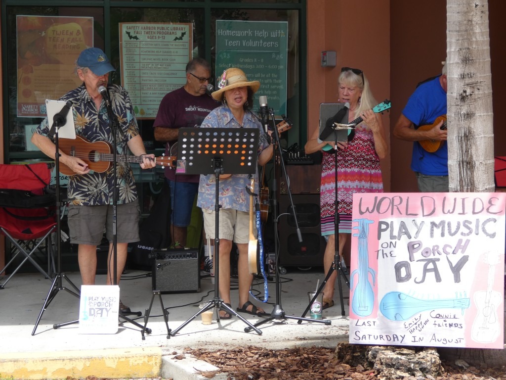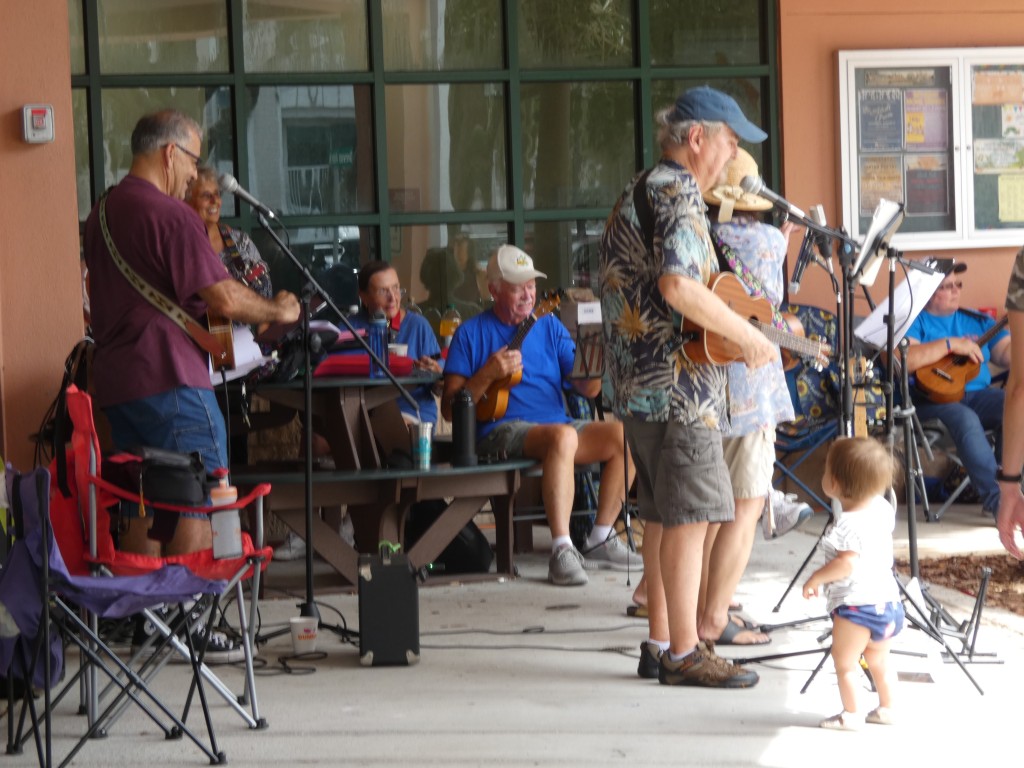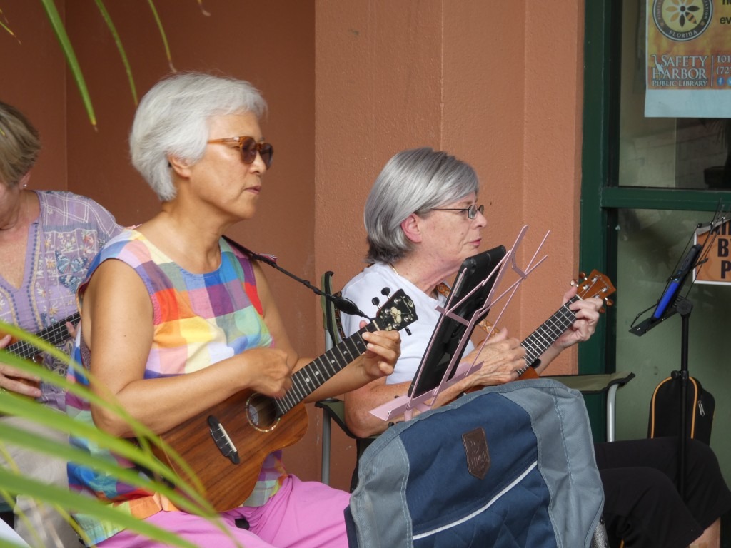 All these years later, a love for the instrument has gained new popularity. Saturday, August 27 was Play Music on the Porch Day and the Safety Harbor Library hosted the Tampa Bay Ukulele Society. I watched uke-carrying men and women set up chairs and chat with fellow musicians in the shadiest spots of the library’s portico. Most appeared of retirement age, but not all – a seven-year-old joined in with his shiny new ukulele, eager to play.