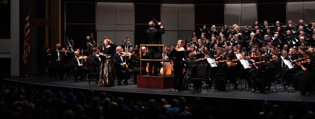 The C-Minor Symphony follows a narrative from death to life, opening with a funeral sacrament and ending in the bliss of heavenly ascension. The orchestra was in full bloom with eight flutes and oboes; eight clarinets and bassoons; 18 horns, trumpets and trombones; two sets of timpani; a pair of harps; an array of pitched and unpitched percussion gadgets; and a full complement of strings. Some musicians played offstage, heard but not seen. Saturday, all these forces whispered in lyrical passages one moment, exploding in fury the next.
