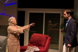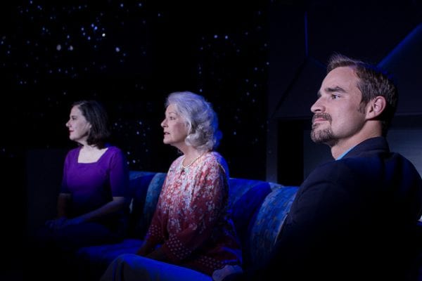 The titular octogenarian in American Stage‘s Marjorie Prime (Janis Stevens) struggles with dementia. A senior Gen-Xer circa 2050, Marjorie receives comfort and companionship from an android-like husband substitute (Brock D. Vickers). She speaks to the computer-aided device that looks exactly like her late husband, Walter, who died 15 years earlier — but a much younger version of him, which disturbs her daughter Tess (Jamie Jones). Tess’s husband, Jon (Steven Sean Garland), provides personal details, revealing family secrets.