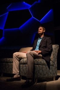 Lighting Designer Chris Baldwin conveys a perfect sci-fi-dystopian atmosphere with colored lights on the device that pulsate when thoughts are processing. The lights and the device add an eerie punctuation to the otherwise typical family discussions. He also creates a breathtaking starscape that washes over the entire set.