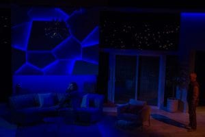 Lighting Designer Chris Baldwin conveys a perfect sci-fi-dystopian atmosphere with colored lights on the device that pulsate when thoughts are processing. The lights and the device add an eerie punctuation to the otherwise typical family discussions. He also creates a breathtaking starscape that washes over the entire set.