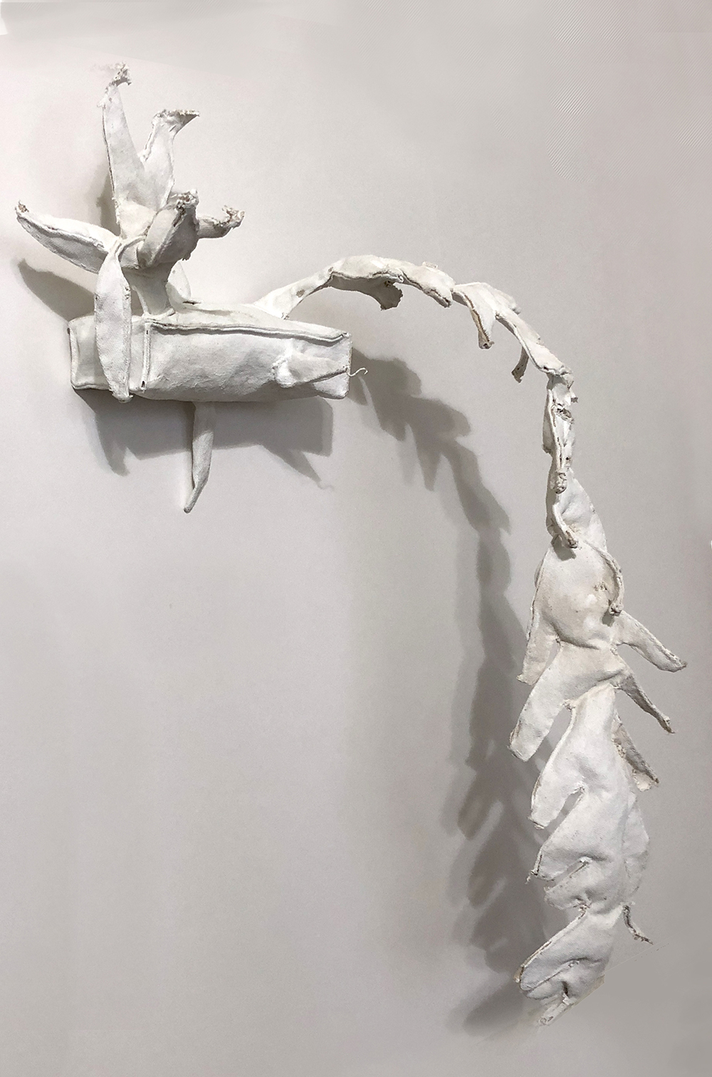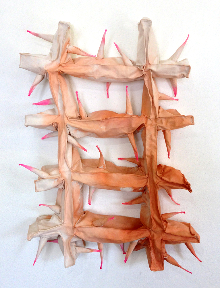 Limp Prick Shelf, 2018, ink sprayed canvas, thread, shredded document, 36x25x6 inches