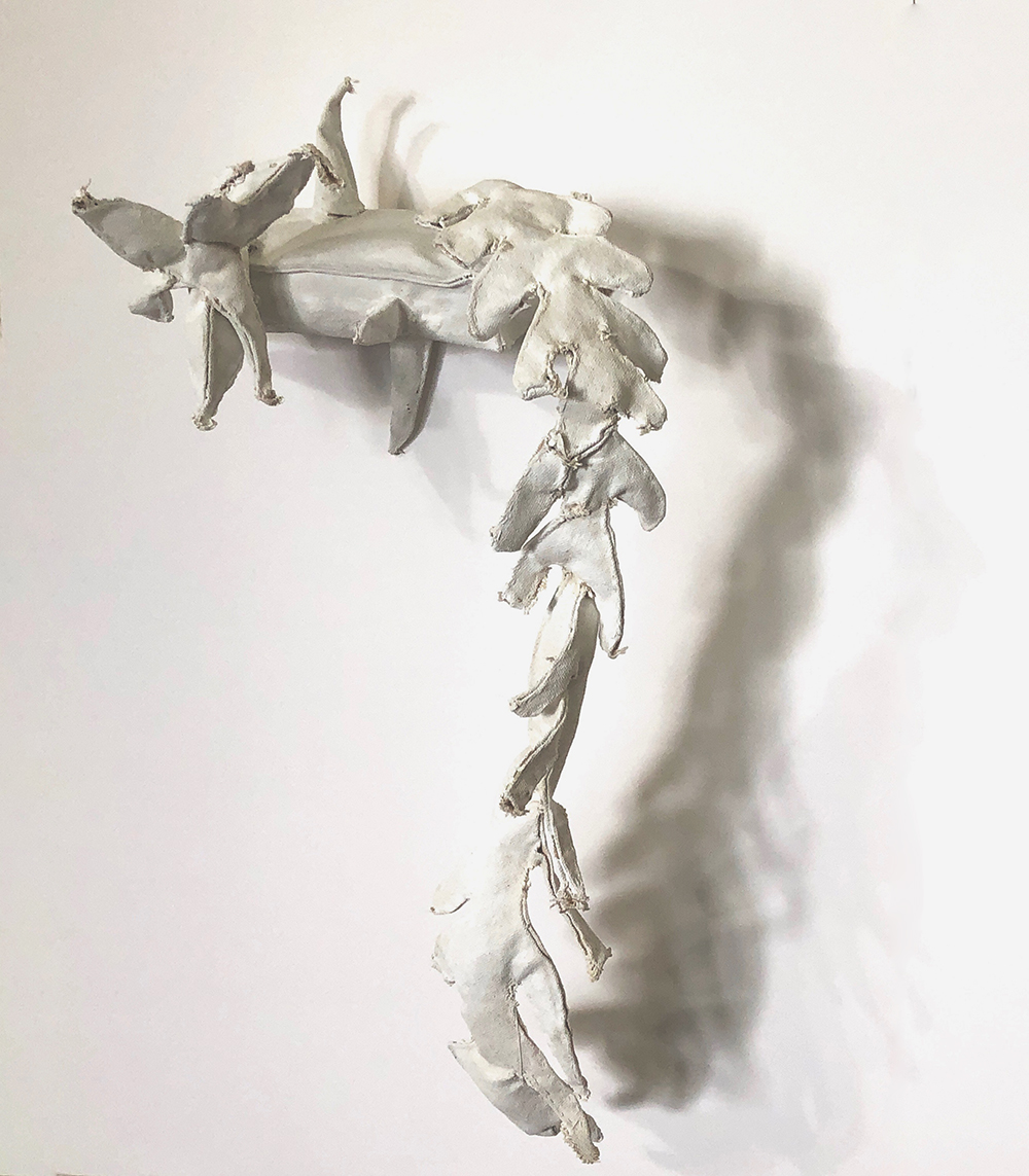 Limp Prick Shelf, 2018, ink sprayed canvas, thread, shredded document, 36x25x6 inches