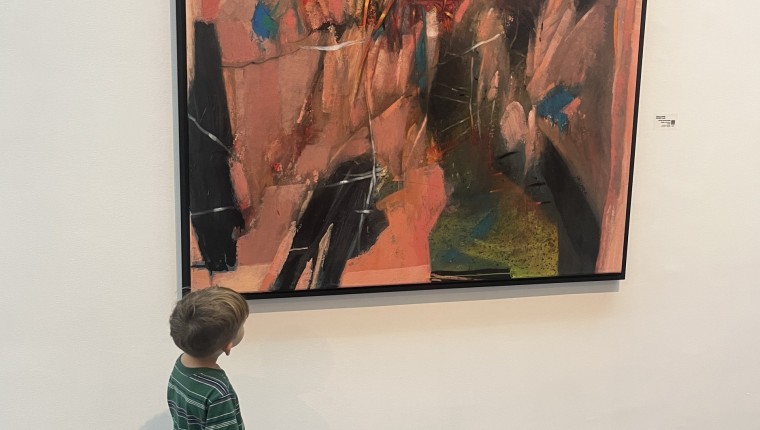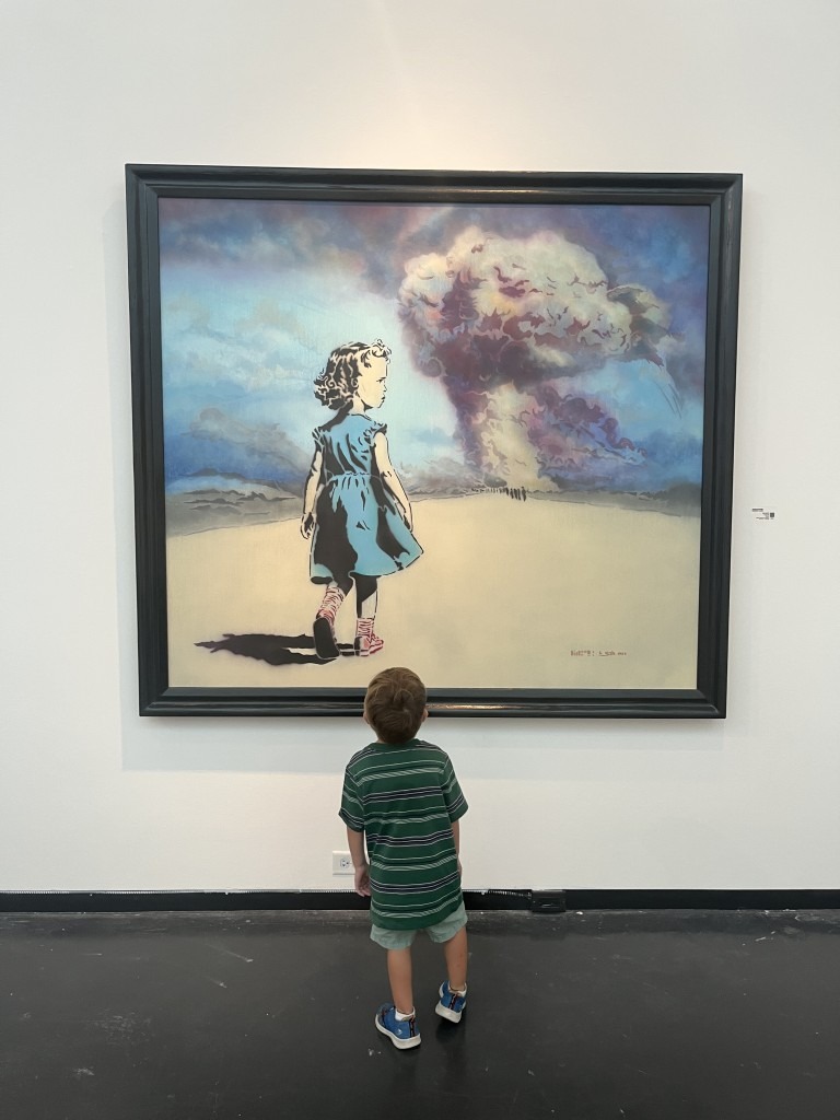 Thomas (now 3) made an impression on me as he gazed up at Luis Soto’s painting titled Nube #2 of a little girl looking perplexed in a desolate landscape with an ominous cloud in the background.