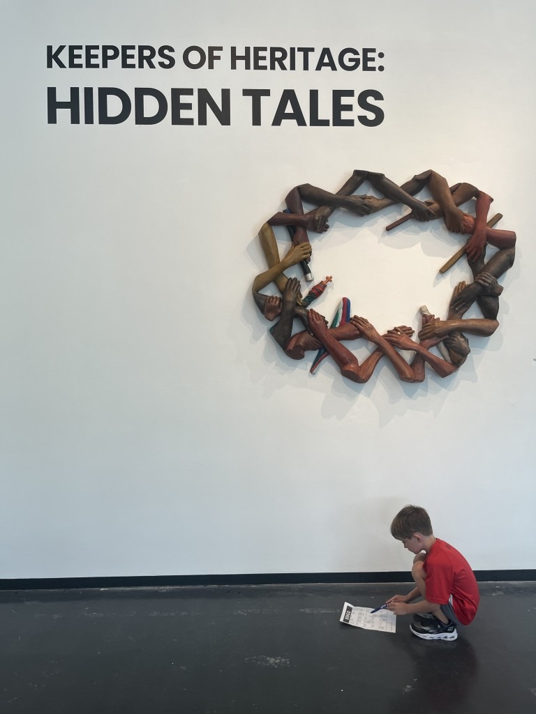 As the name implies, Hidden Tales/Cuentos Ocultos brings to light stories and beliefs that have been overshadowed or disregarded by mainstream narratives. Although we did not discuss this subject matter in great depth, the children enjoyed the exhibition immensely and celebrated the bilingual nature of the titles and descriptive labels.