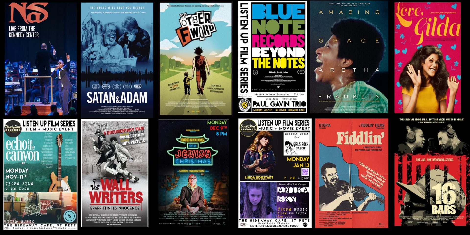 From the beginning we have focused on featuring music documentaries and culture icons. The Hideaway Cafe in St Petersburg has been our home since we started this adventure, with shows the 2nd Monday of each Month.  We have been honored to partner with various organizations around St Pete (Keep St Pete Lit, Girls Rock St Pete, Celma Mastry Ovarian Cancer Foundation, Carroway + Rose and more) as fundraiser / awareness events.  We have welcomed Paul Gavin and his trio, Kristopher James, and Anika Sky to take the stage as part of our Music + Movie Events and of course, we couldn’t have a Movie Night without our music loving MC – 88.5 WMNF’s  All Souls Scott Elliott!