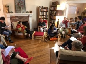 I’m always a little nervous, but more so this time since the story is so offbeat and the casting is a little startling. We share supper, because you always feed people when they’re sharing their time and skills. And then we gather a small crowd of listeners, including the director of our future workshop, Dan Granke – and our choreographer, Paula Kramer.