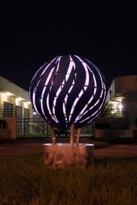 At night, the sculpture glows thanks to the energy-efficient LED lighting installed within the work.