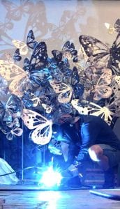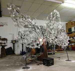 These two stainless steel monarch sculptures “Grand Monarch” and “Kaleidoscope of Monarchs” were commissioned by the City of Riverside, MO. They will be permanently installed this month along the monarch migration route in Renner Brenner Park.