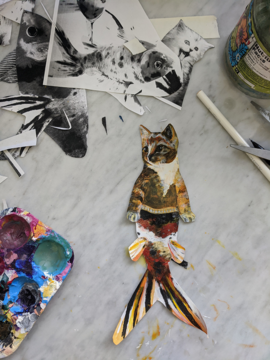 He’s a tabby koi mermaid! As I said, not done yet. Something needs to be done to his chest/tummy. I’ve been taking video of myself making them, maybe those will get edited and released soon! I want to have a video for each collage I make for the Creative Pinellas Emerging Artist show in May (which is hopefully not cancelled, or just gets postponed).
