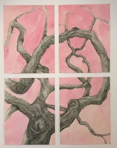 I love texture, parks have lots of texture. Within  parks I can find contrasting forms, textures, color,  line all the design elements used for creative exploration. I’m not a plein-air painter nor do I use watercolor media  mostly  I draw using pencil, and or sharpies. The Florida Live Oak trees are plentiful in the parks. Their textured bark has been an inspiration for my work since 2016 when I created a drawing on Archers Paper using charcoal on a watercolor wash background. There were ( 4) 22”x30” and installed with magnets. It was part of my exhibition Mapping/Marking in 2016 at HCC Gallery 221.