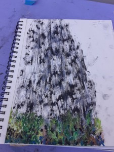 At Sawgrass Park I did tree rubbings from the bark of the Live Oak tree. In this sketch I used charcoal and oil pastels. At Demens Landings Park, a short walk from downtown St. Pete, I drew the rocks and the movement of the water, at Bay Vista Park I drew the Live Oak trees and placed the drawing amongst the fallen leaves.