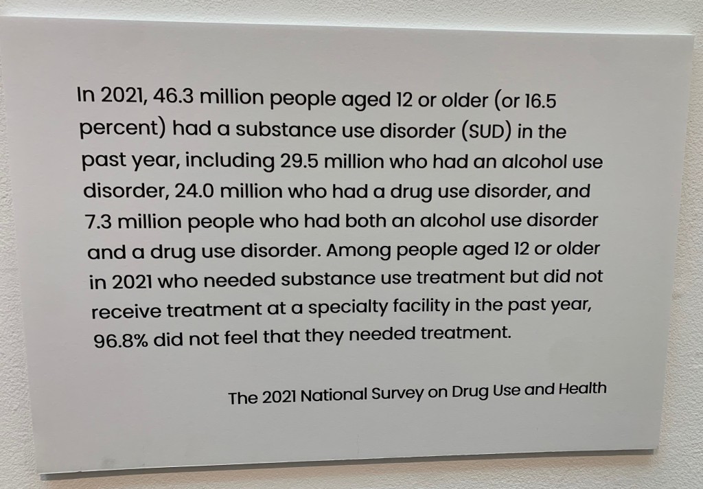 The Sixth Judicial Circuit Court allows non-violent drug offenders who are veterans to complete various challenges in the hopes this will help improve mental and physical health. Creating visual art was one of those challenges – and the walls are lined with quotes, art and statistics that I found surprising. This one is on the wall right as you walk in.