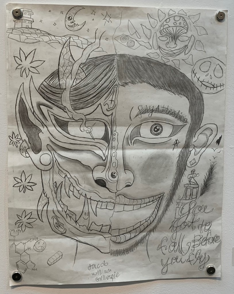 There are dark drawings done as veterans reflect upon their time spent in addiction in pieces like Out of Control, Silent Scream and Mirror Image: A Portrait of Before and After Addiction.