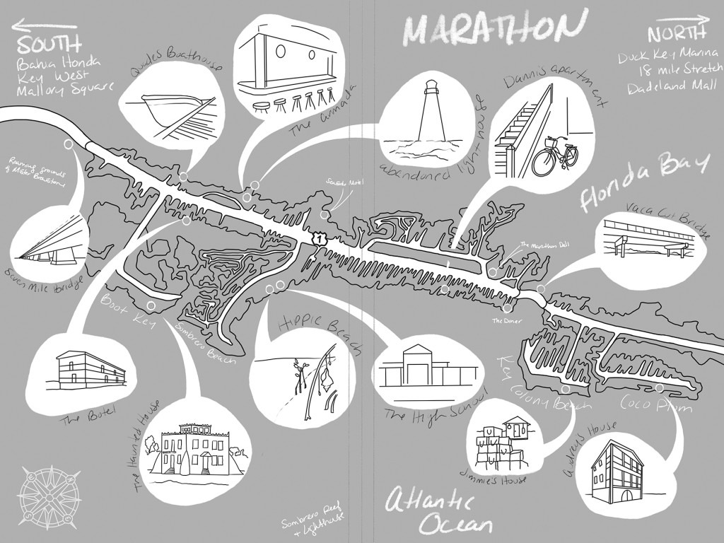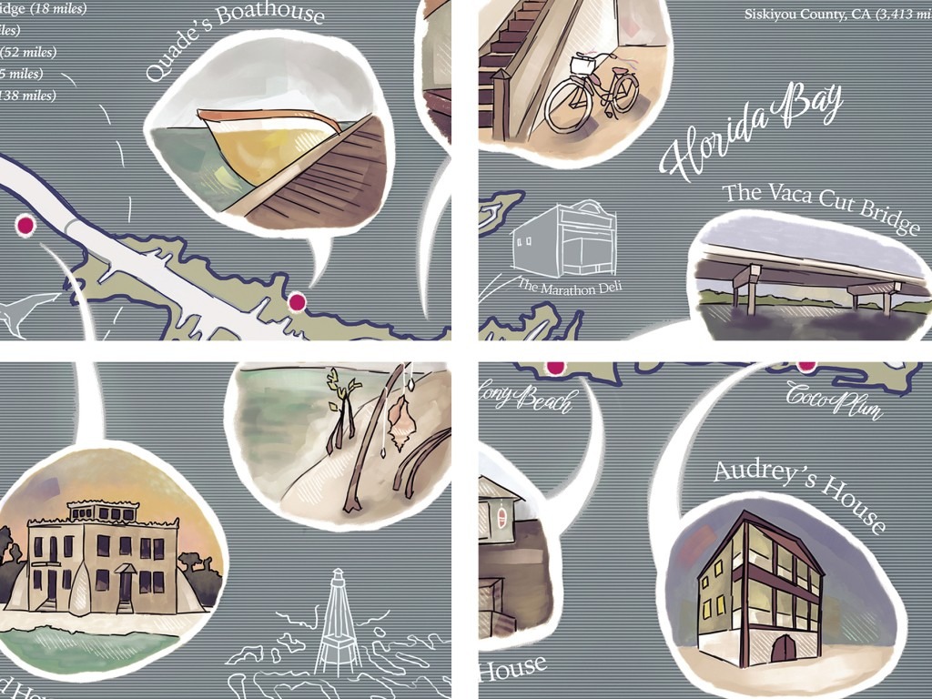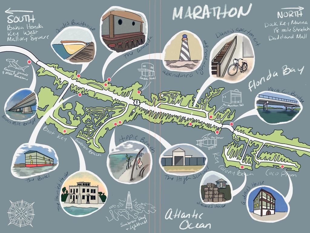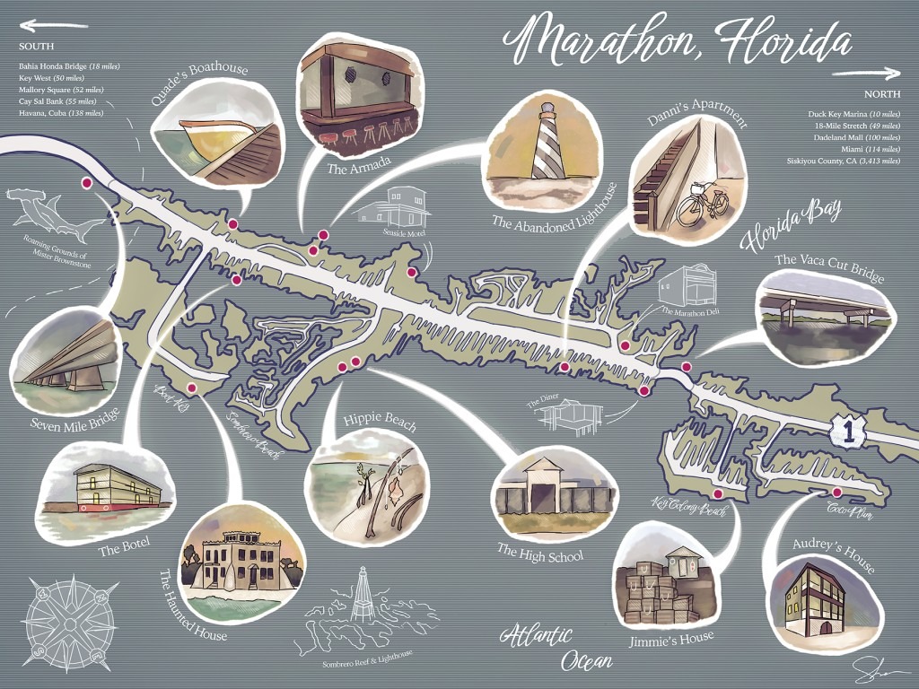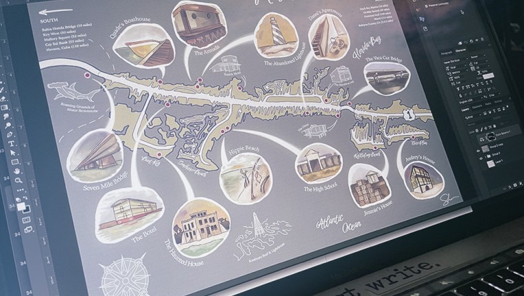 Bands of a Small Hurricane takes place in the Florida Keys, primarily on a small stretch of a town called Marathon. I’ve always loved the creativity of artistic maps, and this story lends itself well to it! The map will be printed in black and white on the interior pages, but I’m super excited to announce that it will also be in color for the first 150 copies. The first 150 hardcover books sold will have a reversible dust jacket, with the map – in full color – on the inside!