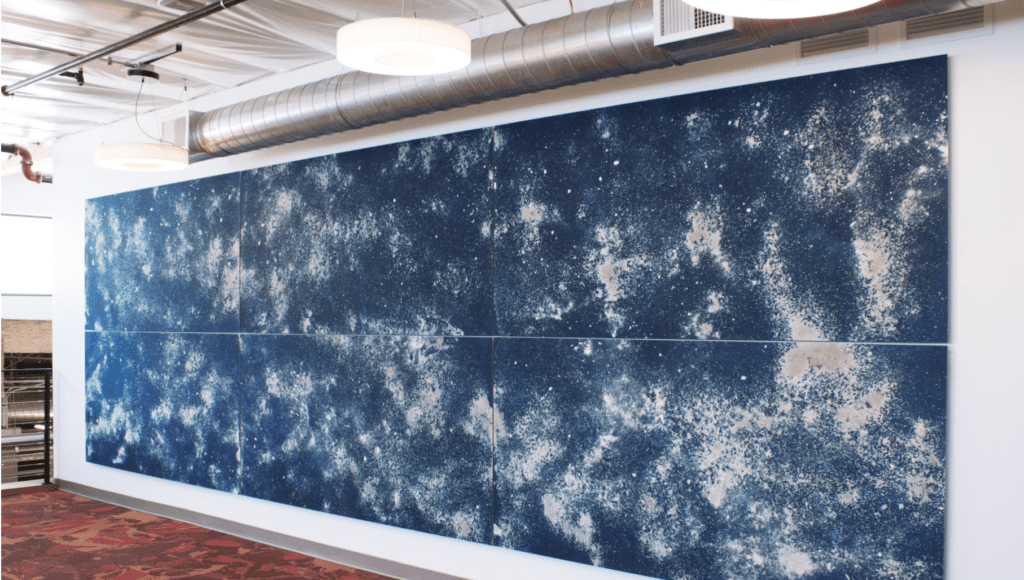 My favorite works by Perrine are her installations. In particular her New Constellations mural project at one of Google’s campuses is absolutely breathtaking, both visually and thematically. I love the deep, moody blue of the cyanotype blueprints with the dusty, airy constellations bursting through the paper. . . I feel like I’m looking deep into space.