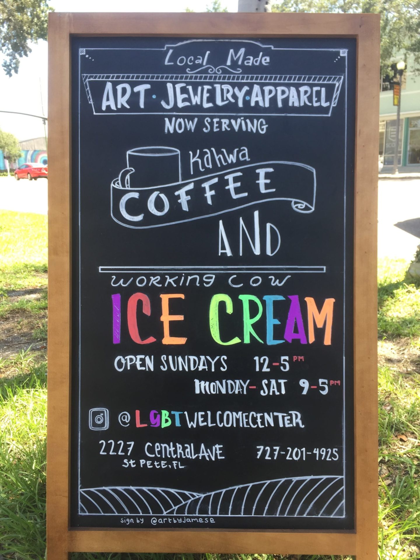 His 2015 move to St. Petersburg reinvigorated his art. He joined the board of the Friends of the Jack Kerouac House. He became involved with Florida Craft Art, first volunteering at events and eventually working as a mural tour guide. He also began focusing on his own art projects. About three years ago, while working on the Kerouac Mural at the Flamingo Bar, the infamous hangout of the late Beat writer who lived his final years in St. Petersburg, Hartzell needed a break. He grabbed a bite to eat at Zaytoon Grill, one of his favorite local restaurants, to clear his head. Since he frequented Zaytoon Grill often, he knew the chalkboard sign outside its storefront well. Sometimes the chalk lettering was smudged; other times, words were misspelled. Needing a break from his mural, he asked the restaurant’s owner if he could redo their sign. “I was having problems with the Kerouac Mural…and it was driving me crazy,” he explains. “So, I asked, ‘Hey, do you want me to do your chalkboard?” I felt like I couldn’t do anything right. I needed to shift projects.” From there, he began regularly designing chalkboard signs for Zaytoon Grill, and his client base also slowly grew. “Some of it was planning, some if it was happenstance,” Hartzell says, adding, “A lot of it is just going to bars and restaurants and asking for the manager. Having a card or a printout with examples of your work is important. You want to save people time and it’s great having the Instagram account and a website, but not everyone has the time to go look at it. So, I’ve started having work samples on the back of cards that show the chalk signs that I’ve done.”