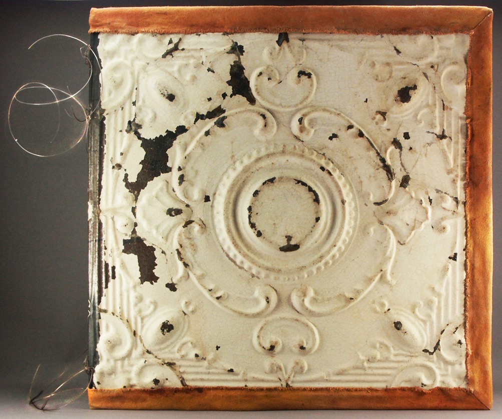 The large book, the Alchemical Text, was made  from rust, tin, linen, intaglio, lithographs and paper. Created by working outside, placing paper onto rusted ceiling tin tiles and letting the Florida rain pummel the paper into the rust surface, thereby creating a matrix for each page.