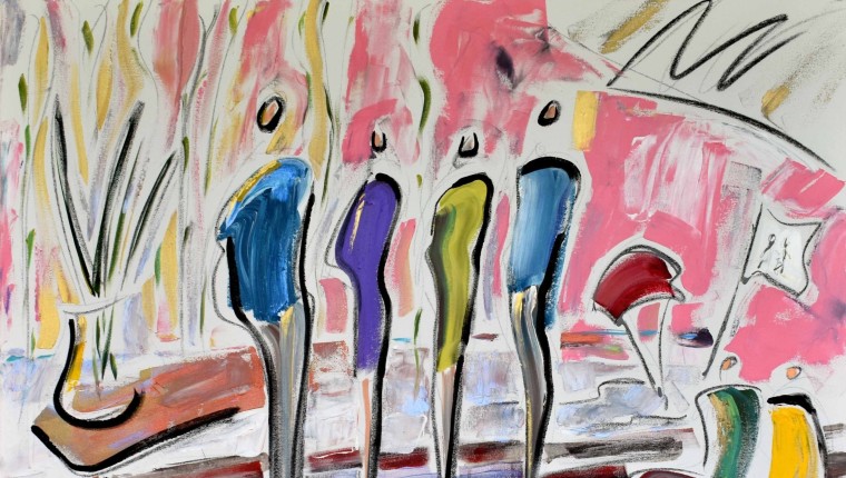 The painting called Dream Week ( matter) is about the week of our wedding in Jericoacoara, Brazil. A week that we spent with only our closest friends and family, mixing our cultures from Brazil and France and seeing connections and friendships being created as if there were no language barriers. Everyone was so intensely connected that there was this shared feeling as if time had stopped only to host those intense moments.