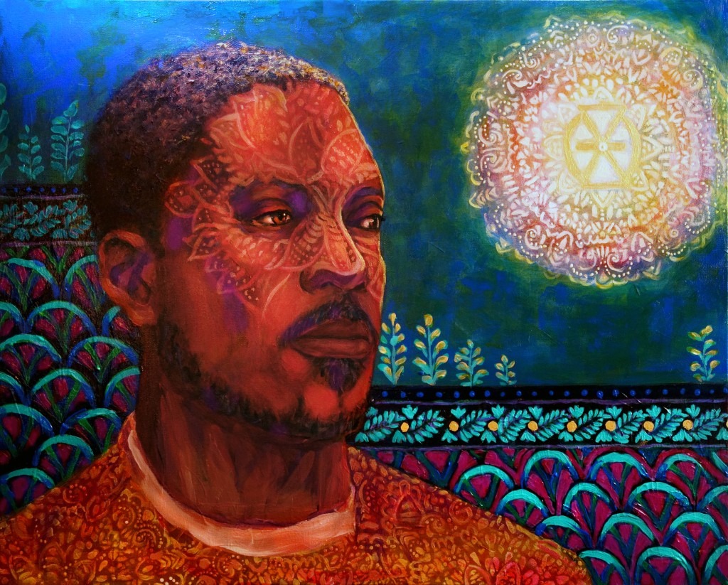 These paintings invite us to ponder the meaning of each symbol within the mandala and how it relates to our life and worldview. The patterned reflection on the figure is a visual representation of the process of our conscious self, merging with the cosmic, to remind us of our relation to the infinite – the world that extends both beyond and within our bodies and minds.