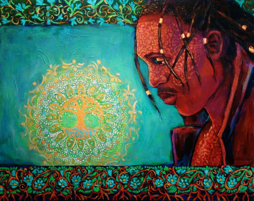 In this painting, The Tree of Life is at the center of the mandala and offers a space where we can contemplate our connections to others and the universe.