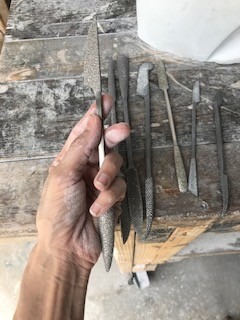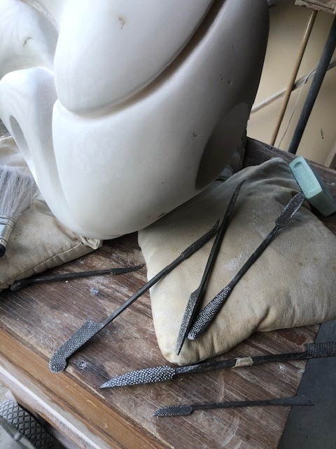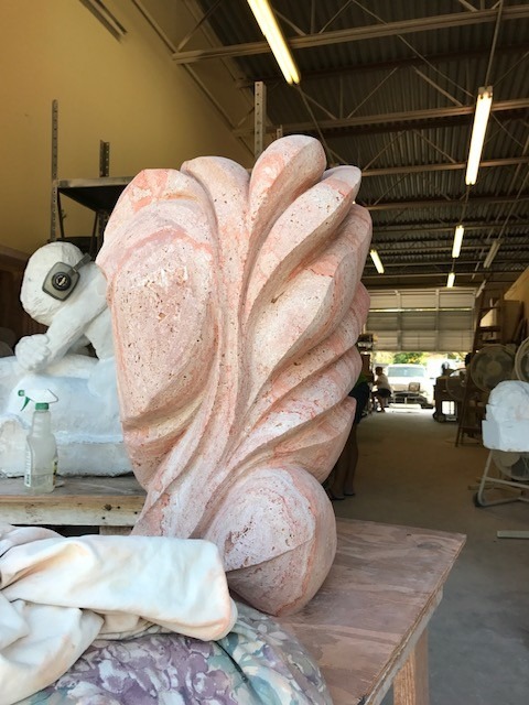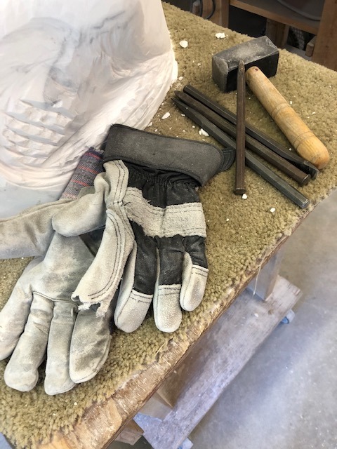 You can listen to this lively conversation, and download the transcript. You’ll find photos below illustrating the stone carving process – from wrestling raw blocks of stone off a truck and using tools that stonecarvers have used for centuries, to finishing a graceful piece you can’t help wanting to touch.
