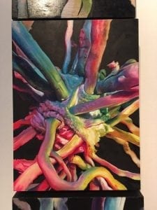 The “Bound” paintings are interpretive records of earlier sculptures that rigidly bound these random bits into chaotic, static forms that appeared dramatically different from every angle viewed. One such narrow perspective of each sculpture was captured first through the lens of an iphone and then filtered through the shifting lenses of the painter – twice removed from the original.