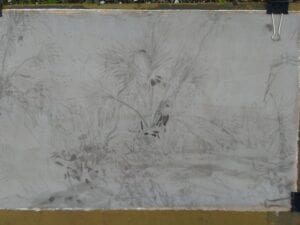 Drawing is not typically compatible with rainy conditions. The traditional chalk gesso ground is hydroscopic and will run if overly saturated. Oil painting is different. A painting ground of oil primer will be durable and remain workable, at least in a light rain. A short work session, but it’s progress.