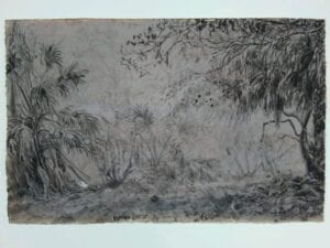 In a plein-air study, I look at several sabal palms (r., center, far left) for what shapes it creates in a composition, how light works around its palmate leaves and spiny “bootjacks” on its trunk.
