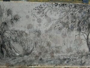 On the other side of the sheet, verso, I began a second study of sabal palms in ink wash. I got in about 15 minutes of work before droplets appeared on the sheet.
