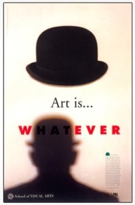 Have you ever been around a little kid who is learning to play a musical instrument? Have you ever been around someone learning to play violin…or better yet, bagpipes? It is painful. And that person would never improve their craft unless someone gave them critical feedback. There is no professional career where critical discernment is not applied, and there is a distinction between good and bad, right and wrong. The visual arts is the only field that I know of where critical discernment and critique is a silent taboo. Milton Glaser designed a poster for SVA (the School of Visual Arts) that uses a René Magritte-esque reference to create a visual metaphor suggesting, “Art Is Whatever.”