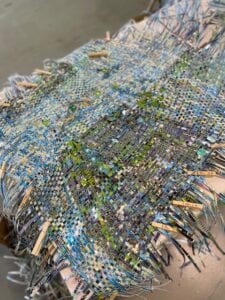 I’ve have the opportunity to use the wonderful 8-ft. long tables in the building. My boss, Brenda, hearing about my misadventures working on half a coffee table, said I could come in and use a table or two and the empty space. There’s no AC but I’ve brought in a fan. I’m not bothered by the heat once I’m “into the weave” or into “the zone.” I take “bathroom” breaks because it’s fully air-conditioned. Wash off my face and then head out to again face the Blue Monster.