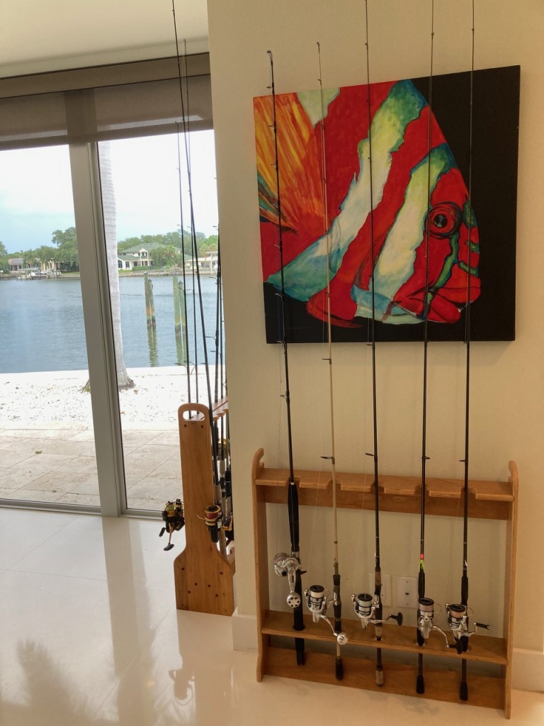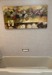 A painting by Herbert Davis called Koi Pond sits above a sunken tub in one of the home’s four+ bathrooms. BC Woo’s Clown Fish is cleverly tucked behind the owner’s collection of fishing rods.