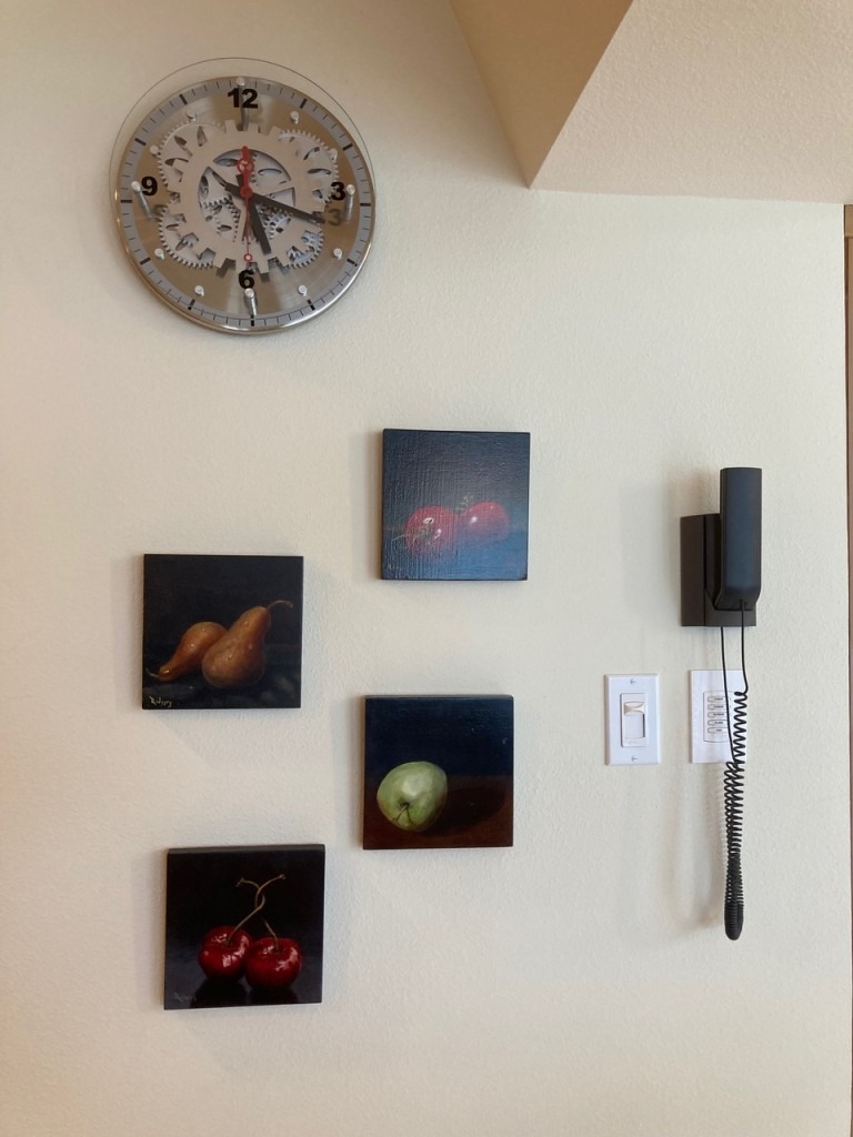 On the kitchen wall four small oil paintings by Lance Rodgers of a tomato, two pears, an apple and cherries create a collage of shapes with a sleek, boxy black telephone and a modern gear-inspired clock.