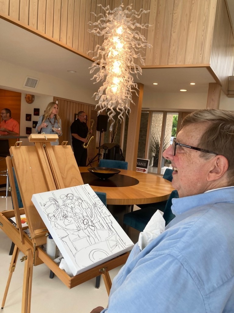 Throughout the evening, I watched Richard Seidel sitting at an easel in a corner under a floating staircase, painting the crowd swirling around him.